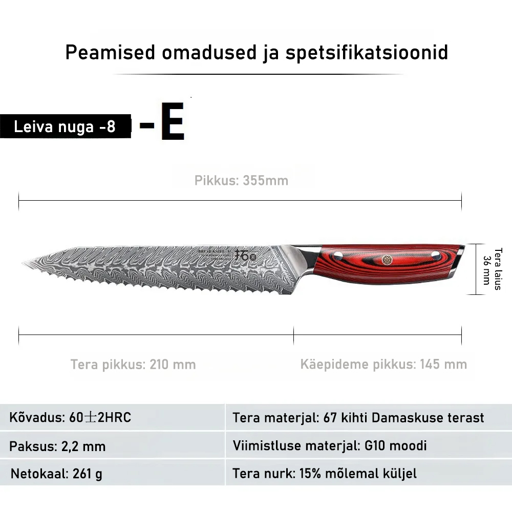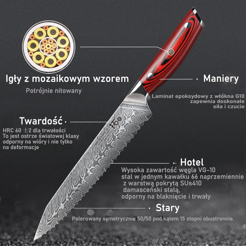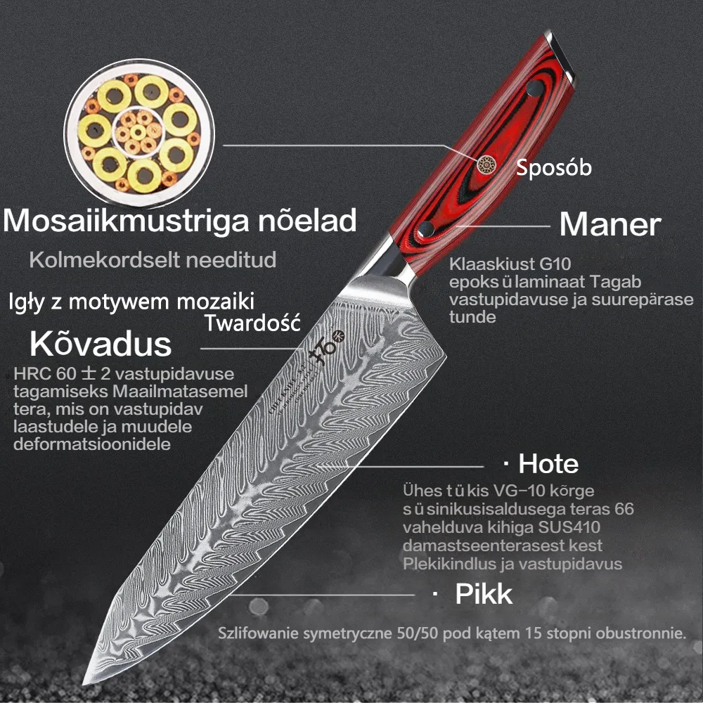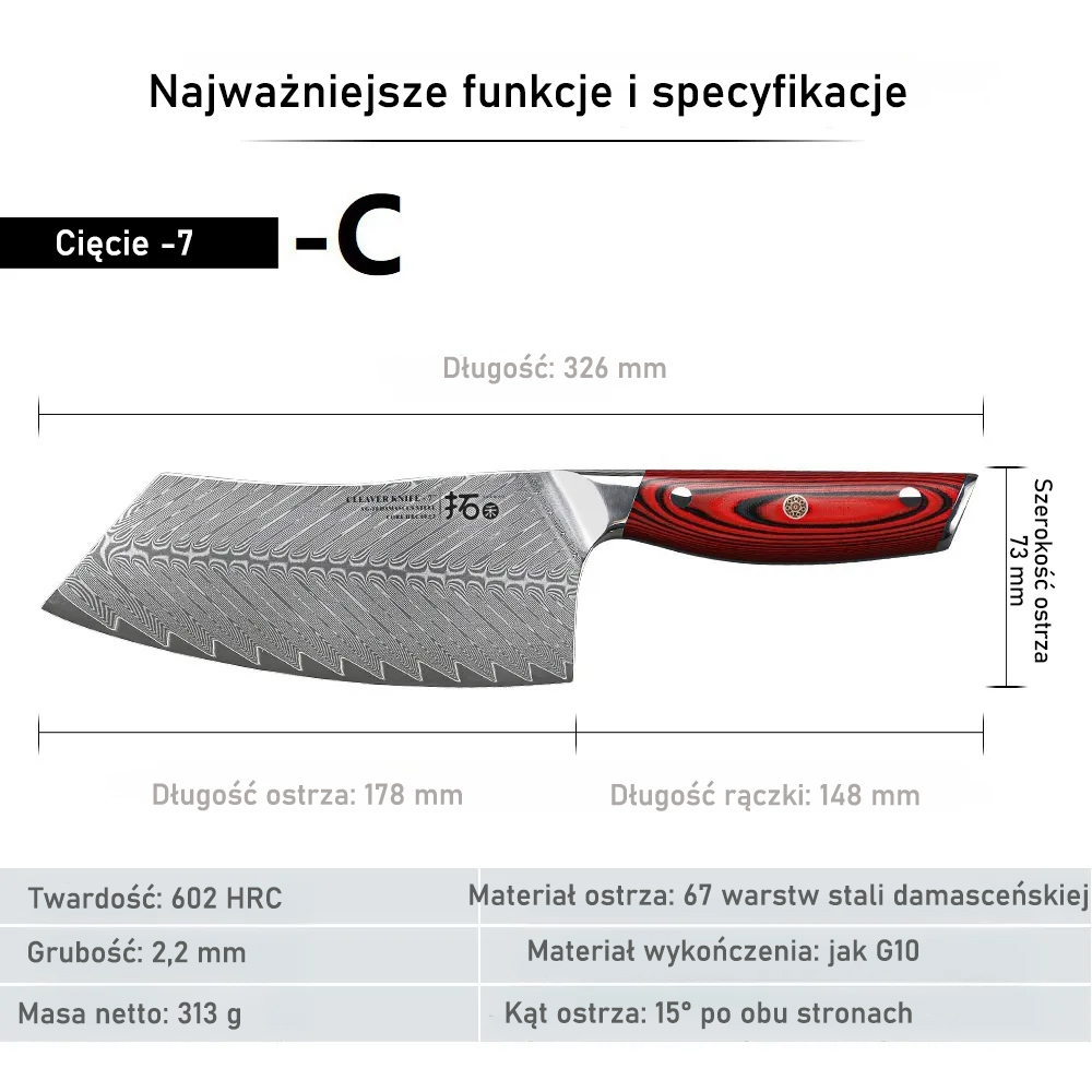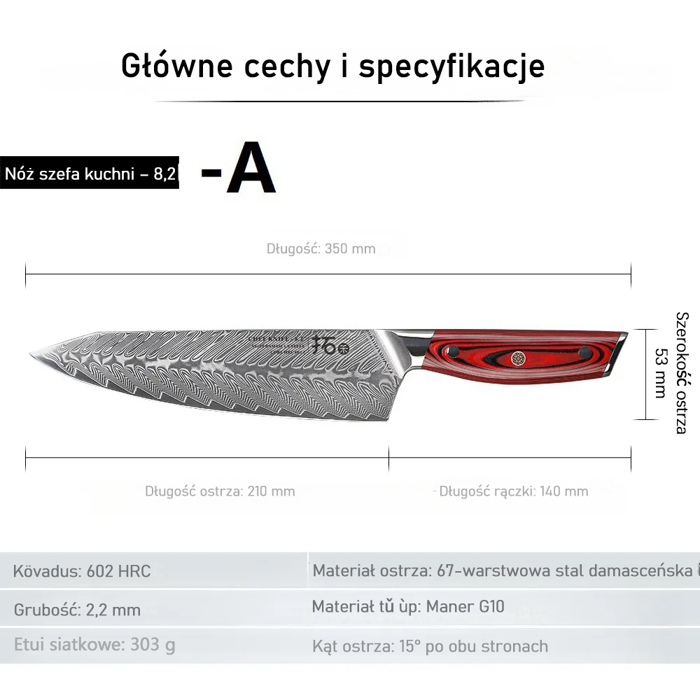 Cechy: Każdy nóż jest starannie wykonany przez wykwalifikowanych rzemieślników i wykorzystuje próżniowo-kriogeniczną obróbkę cieplną. Jest lekki, ostry i trwały, a także wyjątkowo odporny na rdzę. , ostrze jest zwężane w celu zwiększenia ostrości. Uchwyt jest trwały, antypoślizgowy, łatwy do czyszczenia, piękny i zapewnia maksymalną kontrolę przy minimalnej sile. Trwałość, dobre wyważenie, odporność na korozję i elegancki wzór damasceński czynią ten nóż godnym narzędziem dla profesjonalistów.